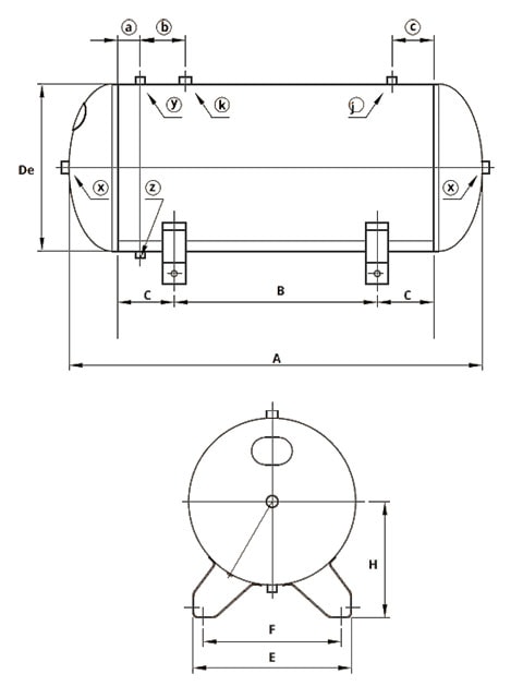 Drift-Air horisontal trykklufttank utstyrt med bunnplate for verksted og industri av høy kvalitet. Godkjent i henhold til direktiv 2014/29/EU. Alle rørforbindelser med innvendig gjenge.