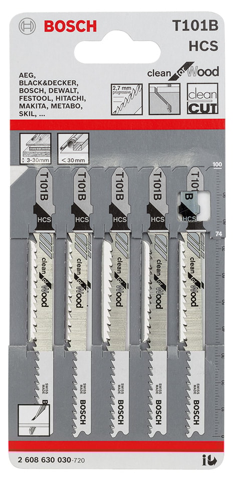 T 101 B Clean for Wood stikksagblad lager rene rette kutt i tre. De presisjonsslipte tennene med konisk utforming gir feilfrie resultater. Dette bladet er laget av høykarbonstål og er egnet for å kutte mykt treverk og ikke-slipende trearbeidsmaterialer. Det har fin progressiv tannavstand (2,7 mm) for kutting i trematerialer med en tykkelse på 3-30 mm.