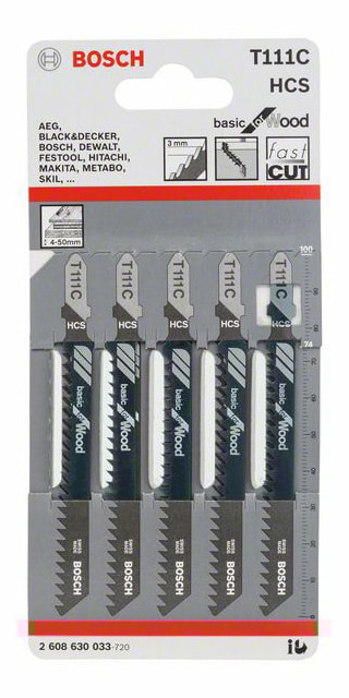 T 111 C Basic for Wood stikksagblad lager rette kutt i tre. Det har valsede tenner på siden som er perfekte for kutt uten spesielle krav. Bladmaterialet av høykarbonstål er egnet for å kutte mykt treverk, og ikke-slipende trearbeidsmaterialer. Middels tannavstand (3 mm) gjør at bladet kutter trematerialer med en tykkelse på 4-50 mm.