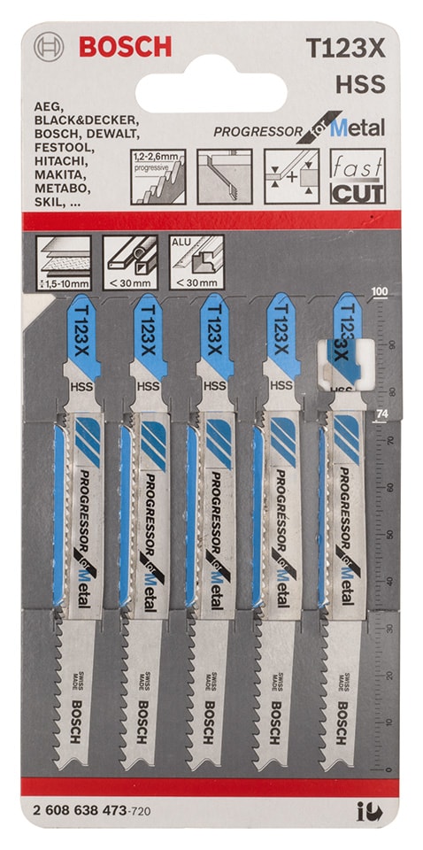 T 123 XF Progressor for Metal stikksagblad er brudsikkert og gir raske rette kutt i tykt og tynt metall. Tanngeometrien med økende tannavstand gjør at bladet kan brukes i materialer med en lang rekke tettheter. I tillegg er bladets valsede bølgetenner utformet for raske kutt i metallplater. Den fullherdede, HSS (høyhastighetsstål) tannstripen på bladet er laget av BIM (bi-metall) og er festet til en svært elastisk base av HCS (høykarbonstål), noe som reduserer risikoen for brudd og gir den nødvendige hardheten og fleksibiliteten til å kutte perforerte metallplater laget av stål med standard hardhet. Sagbladet har fin progressiv tannavstand (1,2-2,6 mm) og kutter mange ulike tykke og tynne metallplater med en tykkelse på 1,5-10 mm.